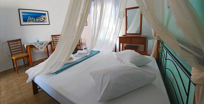 Piccolo complesso di studio a gestione familiare, costruito con la tradizionale calce bianca e punteggiato di infissi blu che contribuiscono a rendere l’atmosfera tipicamente greca e accogliente. Si trova a pochi passi da una minuscola spiaggetta e passeggiando con i piedi nelle acque cristalline potrete percorrere tutta la piccola baia di Karavostasi, fino ad arrivare al tratto un po’ più ampio della spiaggia cittadina e al caratteristico porticciolo. Alle spalle di quest’ultimo si trova la più nota spiaggetta di Vardia, anch’essa dai colori invidiabili. Proposta perfetta per coppie alla ricerca di un angolino romantico e intimo!
