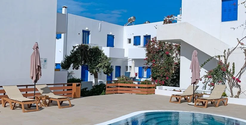 Piccolo hotel semplice e funzionale gestito con passione dalla gentilissima proprietaria, con il plus di poter utilizzare la graziosa piscina dell’hotel fratello Apollon (vd catalogo Eden Viaggi Grecia). È, inoltre, situato in ottima posizione ad appena 50 metri da una spiaggetta privata prevalentemente rocciosa, mentre con qualche passo in più potete raggiungere anche quella più ampia di Pollonia e il suo grazioso porticciolo. Qui la sera potrete rifocillarvi in una delle tradizionali taverne con la sostanziosa cucina greca, ideale per recuperare le forze dopo lunghe giornate trascorse vagabondando per l’isola. Il modo migliore per scoprire Milos è noleggiare un mezzo e armarvi di una buona mappa... il sottosuolo ricco di minerali e l’azione del vento e del mare fanno sì che quest’isola sia ricca di grotte, cave e baie di incredibile bellezza.