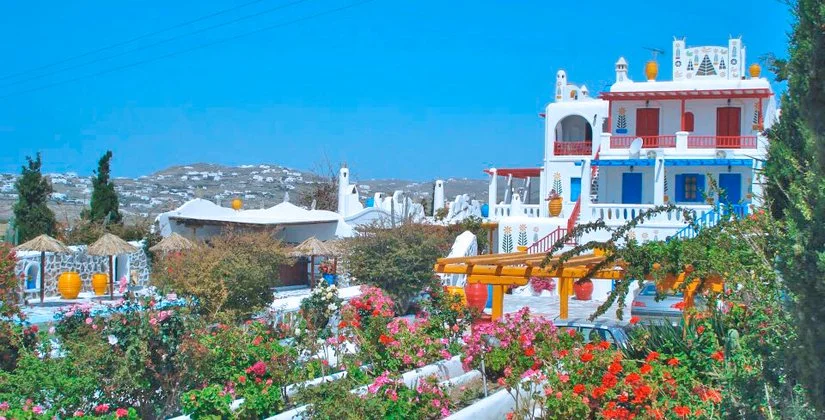 Si tratta di una struttura molto graziosa costruita in tipico stile cicladico e con dettagli esterni coloratissimi che la rendono fresca e sbarazzina. Gli studio sono semplici ed essenziali, ma dotati di tutti i comfort necessari ad una vacanza indipendente, con arredi in legno scuro e soffitti con travi a vista. La spiaggia più vicina è quella di Ftelia, vero paradiso per i surfisti, vista la sua posizione particolarmente ventosa. Da non perdere una visita a Mykonos Città e alle più rinomate spiagge dell’isola, raggiungibili velocemente abbinando al proprio soggiorno lo speciale auto o scooter, con il quale potrete muovervi in piena libertà e che risulterà molto comodo data la posizione un po' defilata della struttura, perfetta per riposare in tranquillità fuori dal caos della Chora.