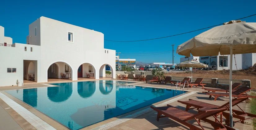 Piccolo complesso a conduzione familiare con studio funzionali, curati e ben tenuti e una bella area piscina. Perfetta la sua posizione proprio a due passi da tutti i servizi, compreso un comodo supermercato, e soprattutto dalla spiaggia di Agios Prokopios, che viene considerata una delle più belle di Naxos per la sua sabbia dorata e le acque cristalline. Sicuramente una buona proposta balneare, coccolati dall’accoglienza e gentilezza dei proprietari verso i propri ospiti.