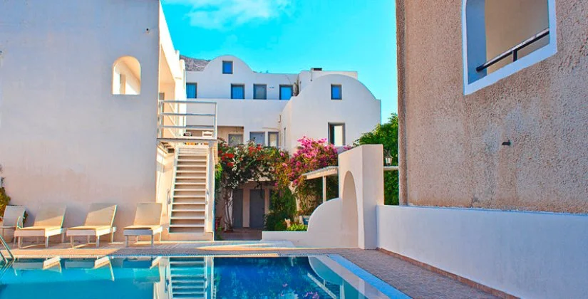 Gradevolissimo complesso di camere e monolocali costruito in stile cicladico con volte a botte, tipico delle case scavate nella caldera e qui riproposto a cielo aperto, con i caratteristici colori tenui dell’isola. Anche se non si affaccia direttamente sul mare, l’Anthea è collocato in un punto strategico, da cui si raggiunge in pochi minuti a piedi il centro di Perissa, con la sua spiaggia nera e i numerosi locali che si animano alla sera. Anche le altre località dell’isola si rivelano comodamente raggiungibili, usufruendo a scelta del servizio di bus pubblici. Chi è più dinamico e avventuroso potrà in alternativa noleggiare uno scooter e sfrecciare sulle tortuose strade dell’isola sino alla cima della Caldera, per godere di tramonti mozzafiato. Inerpicandosi, invece, sulla collina che separa Perissa da Kamari potrete ammirare l’antica Thira, che veglia da millenni i numerosi turisti che si rilassano sulle sue spiagge, respirando da quassù quel sentimento magico che pervade l’isola e il suo vulcano.