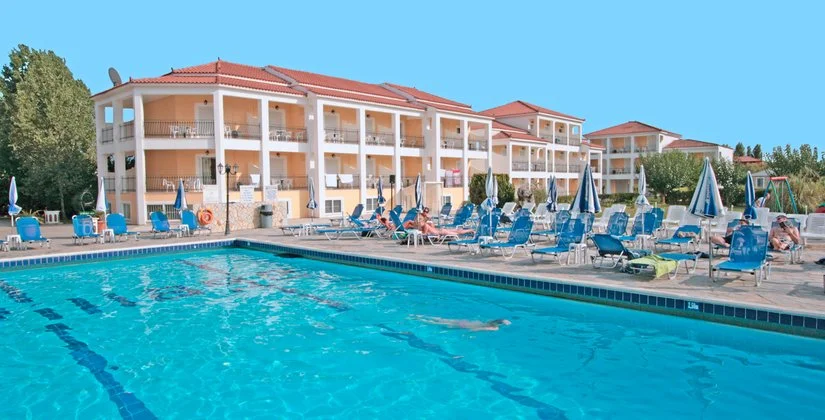 Questo grande complesso è situato in posizione leggermente defilata rispetto alla spiaggia di Laganas ed è perfetto per i giovani che vogliono soggiornare nella località più movimentata dell’isola. Dispone di diverse soluzioni in studio o maisonette in grado di ospitare fino a 4 adulti, arredati in modo semplice e attrezzati con funzionali angoli cottura, benché il trattamento base sia in mezza pensione.